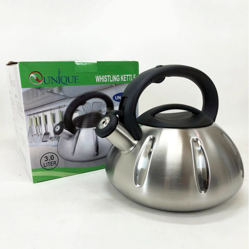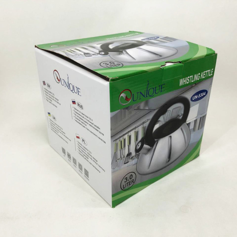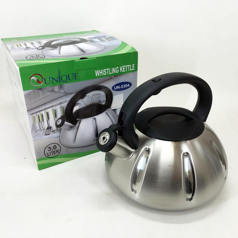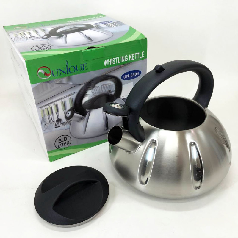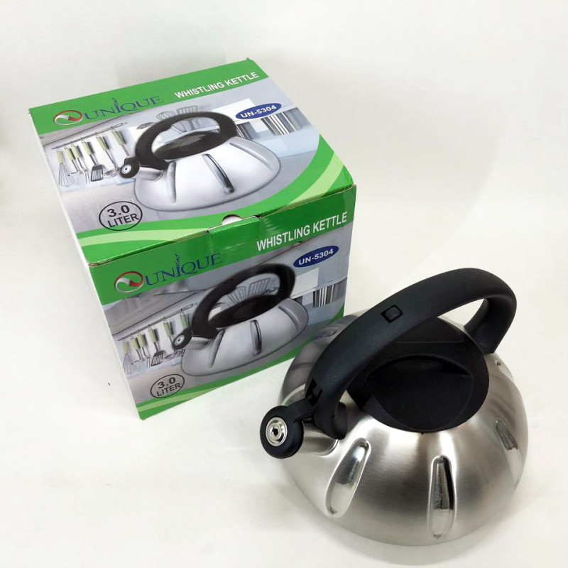 Чайник Unique UN-5304 mdash; втілення практичності та краси. Unique UN-5304 виготовлений з високоякісної нержавіючої сталі, яка одночасно дуже легка і міцна у використанні. Внутрішня сторона даного чайника має покриття з нержавіючої сталі, яке полегшує догляд за чайником та безпечне для здоров’я. Зручна ручка виготовлена з нейлону, а її конструкція розроблена так, що вона не нагрівається навіть після тривалого кип’ятіння води. Чайник оснащений спеціальним свистком, який повідомить Вам про те, що вода закипіла. На ручці даної моделі є спеціальний важіль, за допомогою якого легко і просто можна відкривати і закривати свисток. Цей чайник підходить для всіх типів плит.