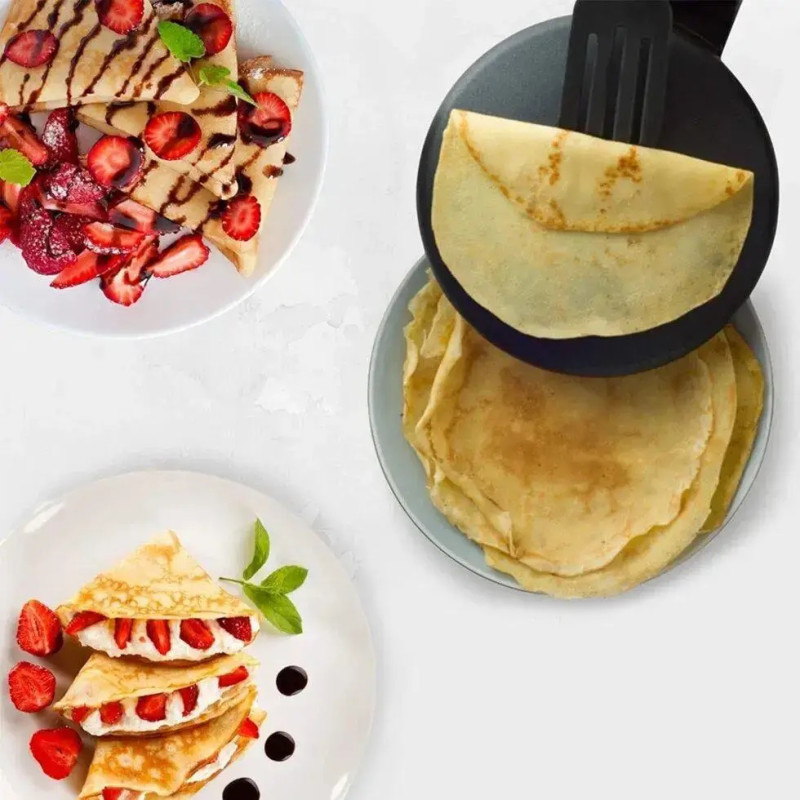 Електрична млинець – це компактний і зручний пристрій для швидкого приготування смачних млинців, оладок та тонких коржиків. Завдяки діаметру поверхні 20 см вона ідеально підходить як для порційних млинців, так і для закусочних варіантів. Занурювальний тип конструкції дозволяє легко захоплювати тісто та рівномірно розподіляти його по робочій поверхні, що особливо зручно при приготуванні тонких та акуратних млинців. Модель оснащена антипригарним покриттям, яке запобігає прилипанню тесту та полегшує процес приготування. Це дозволяє готувати без додавання олії, роблячи страви дієтичнішими. Поверхня легко очищається – Достатньо протерти її вологою серветкою після використання. Таке покриття не тільки полегшує догляд за пристроєм, але й продовжує термін його служби.