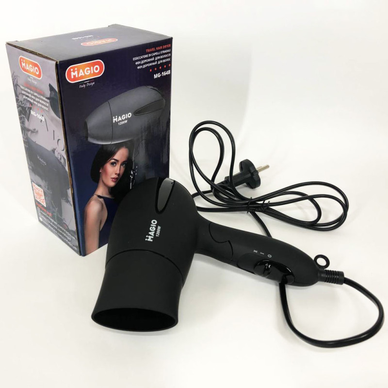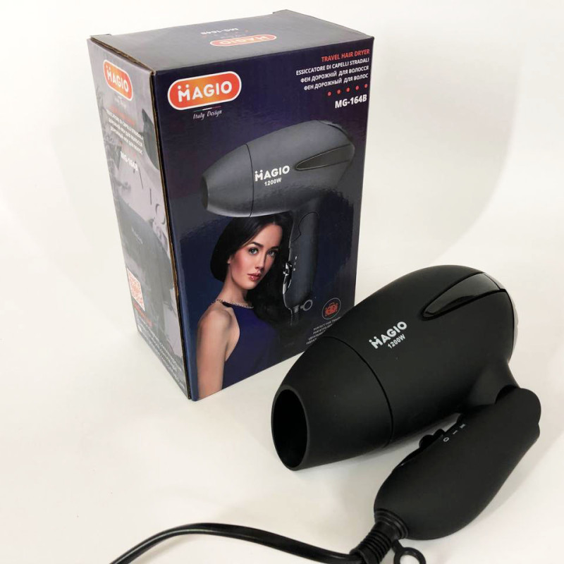 Фен MG-164B — це ідеальний компактний фен для подорожей та відряджень зі складною ручкою. Для своїх компактних розмірів він має досить високу потужність — 1200 Вт, тому фен швидко сушить волосся без перегріву.