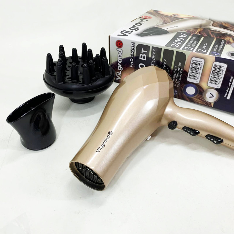 Корпус фена ViLgrand VHD-2424TI Blue містить потужний і надійний мотор 2400 Вт, який створює потоки теплого повітря в двох швидкісних і трьох температурних режимах. Функціональність виробу також підвищується комплектною насадкою-концентратором та дифузором.