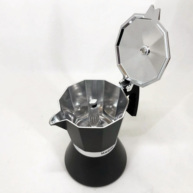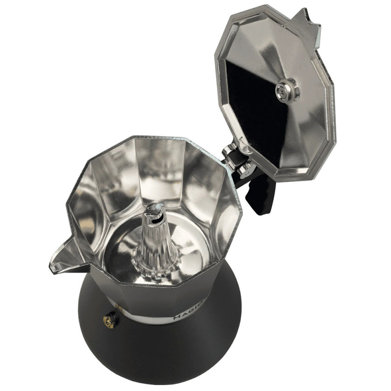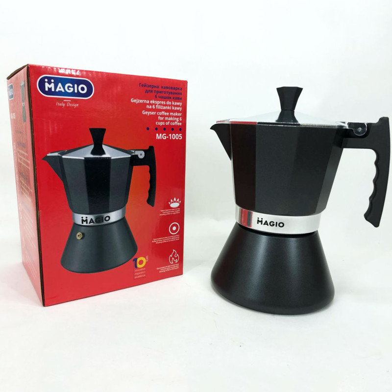 Класична гейзерна кавоварка MG-1001 прекрасно підходить для приготування традиційного еспресо. Виготовлений із безпечного алюмінію, який може вступати в контакт із харчовими продуктами, ручка із термостійкого пластику. Підходить для використання на газових, електричних плитах та багатті.