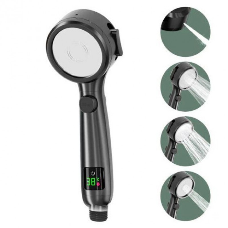 Лейка насадка для душу під тиском з індикатором температури – Насадка для душу може безпосередньо зчитувати температуру і допомагати вам вибирати найкращу температуру води, що ідеально підходить для дітей, домашніх тварин і вашого душу! 4 режими різних струменя, включаючи струменевий, масажний, дощовий і потужний струмені. Кожен режим може забезпечити різні природні спа-процедури, дозволяючи вам і вашій сім’ї насолоджуватися розслаблюючим та комфортним душем вдома, а також може використовуватись для щоденного прибирання ванної кімнати. Функція паузи особливо зручна і корисна, коли ви використовуєте мило, гель для душу або миєте волосся, не можете розплющити очі, ви можете натиснути кнопку паузи в будь-який час, що дозволяє уникнути непотрібної витрати води.