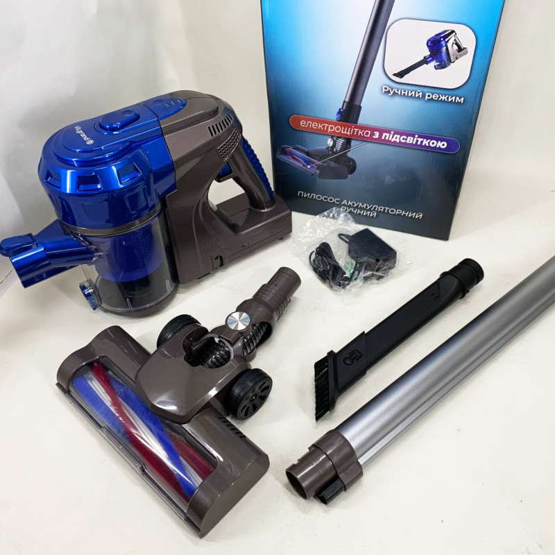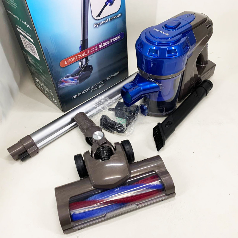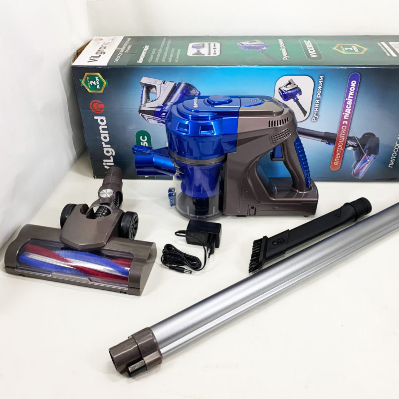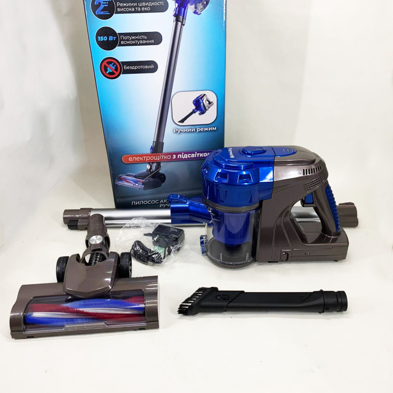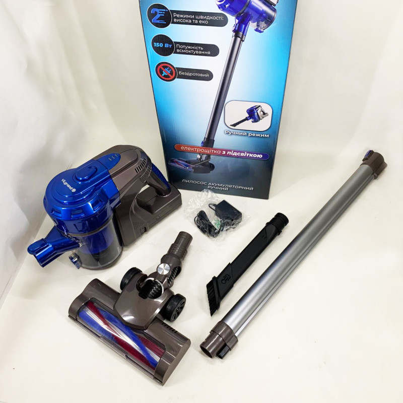 - Комплектація: Корпус приладу, Алюмінієва труба, Блок акумуляторної батареї ,Зарядний адаптер, Щітка для підлоги ,Комбінована щітка, Настінний тримач