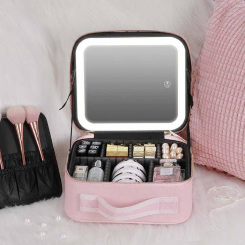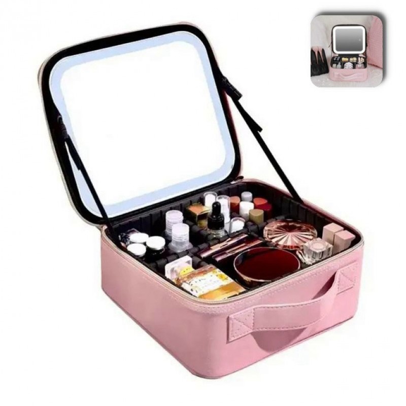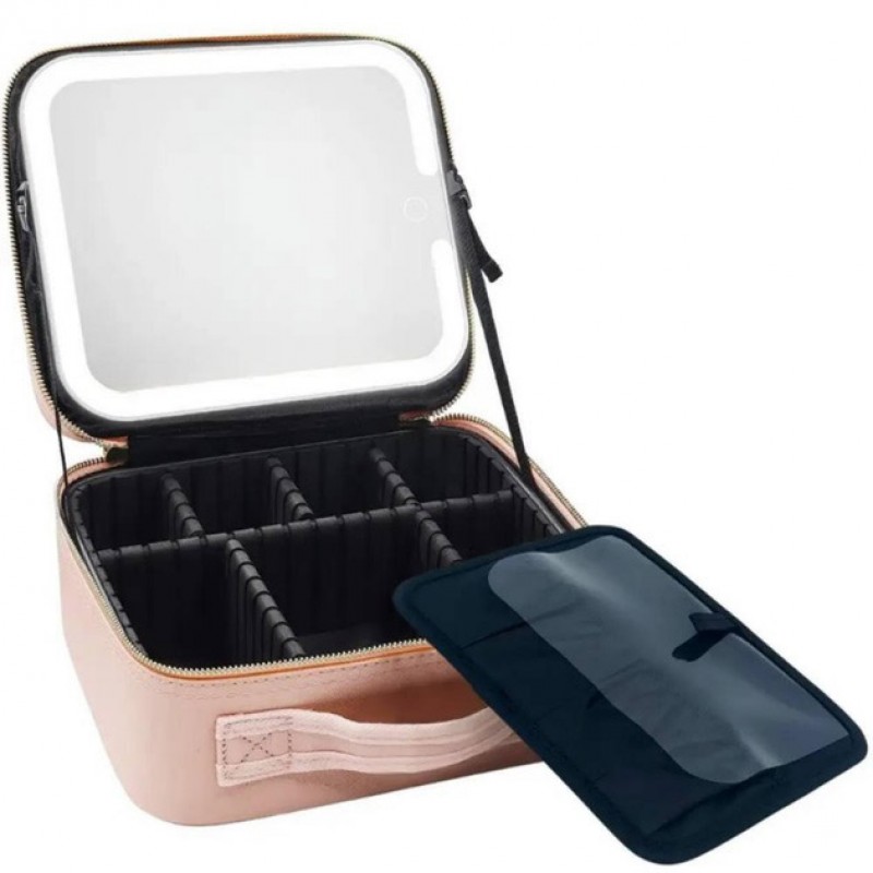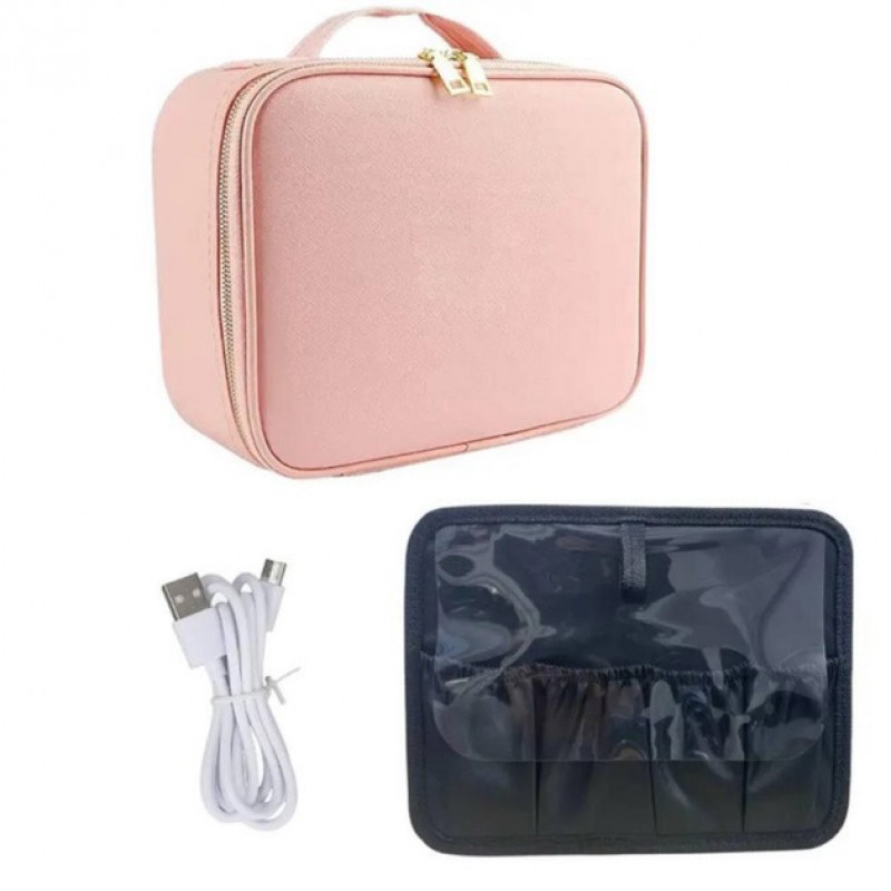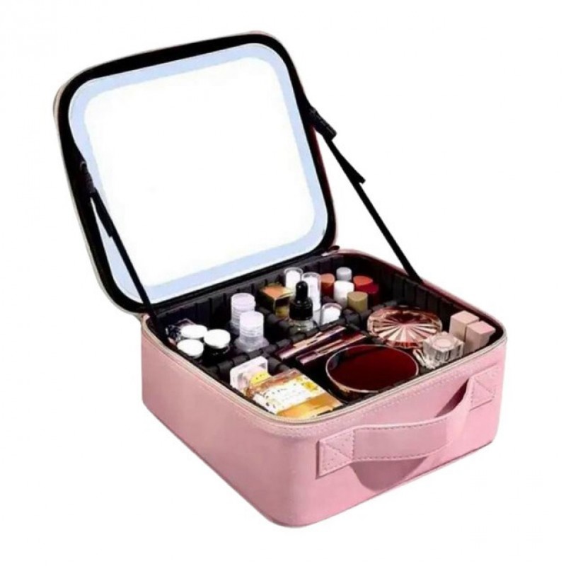 Портативна косметичка органайзер дорожній бьюті кейс з ручкою для з дзеркалом та LED-підсвічуванням рожевий