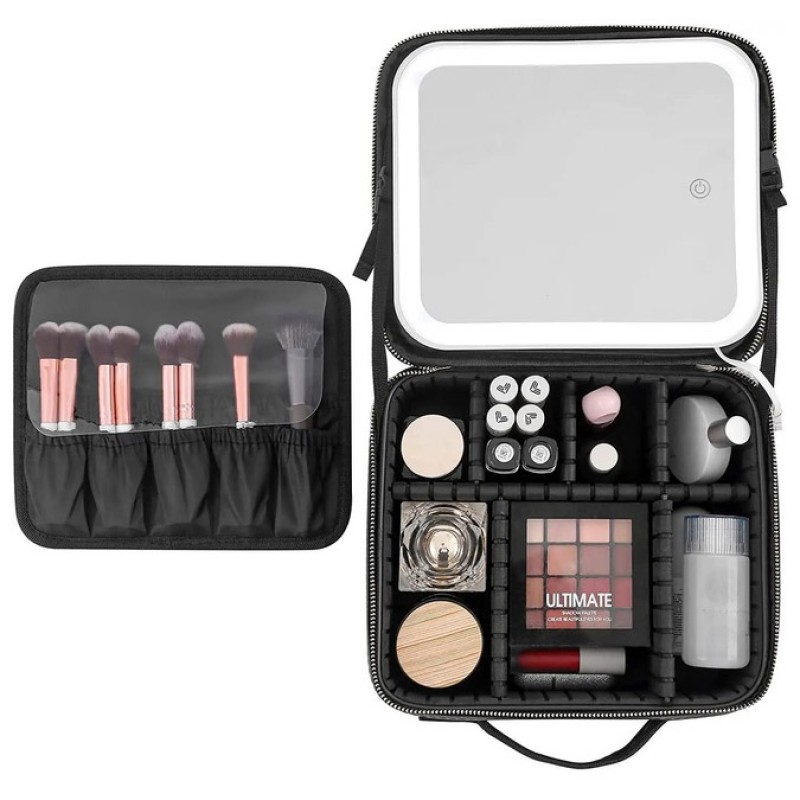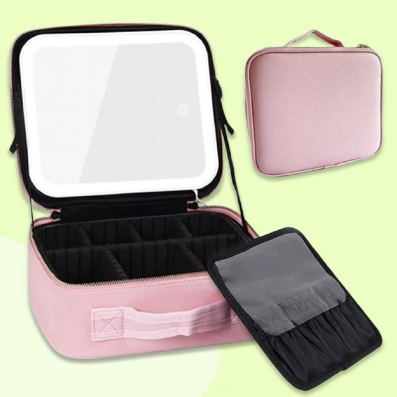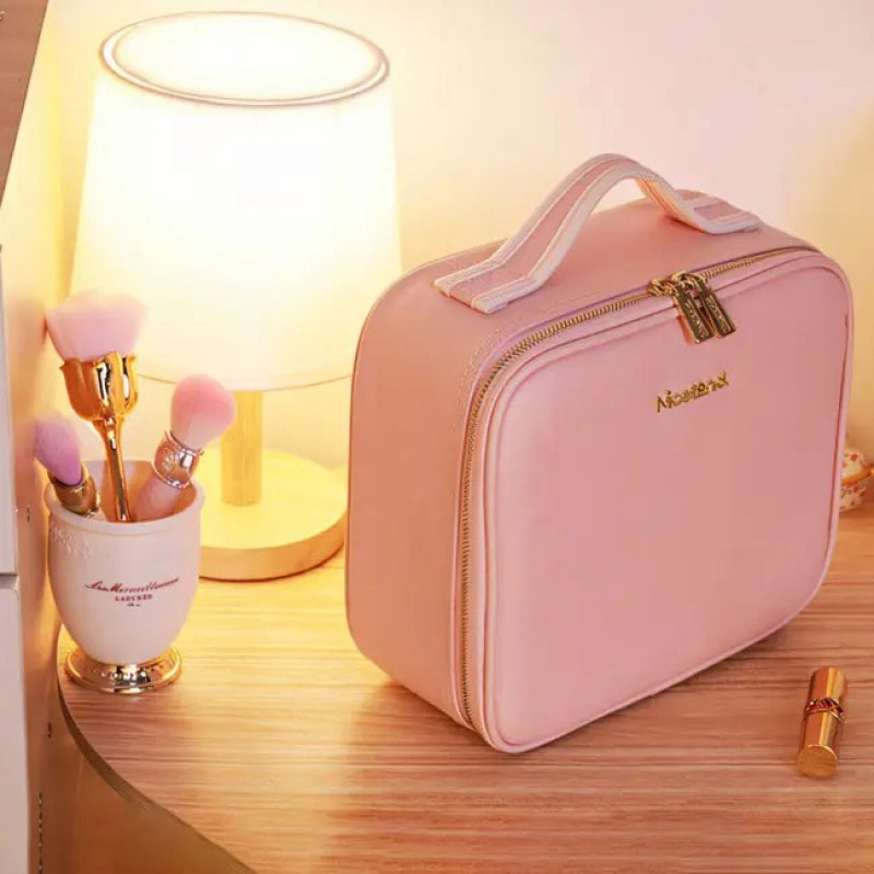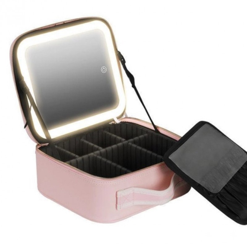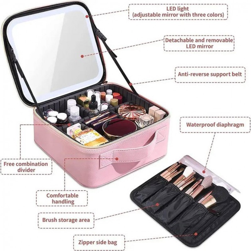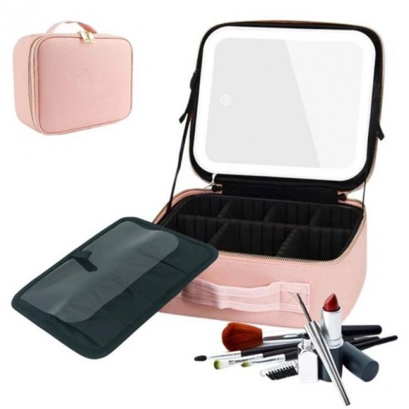 Портативна косметичка органайзер дорожній бьюті кейс з ручкою для з дзеркалом та LED-підсвічуванням рожевий