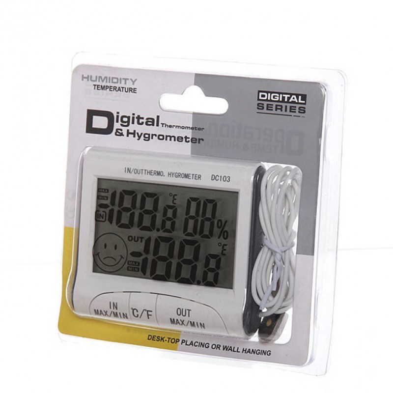 Крім температури і вологості в приміщенні, приладом можна вимірювати температуру повітря на вулиці за допомогою виносного датчика температури, що йде в комплекті, довжиною 1 метр. Працює DC-103 від однієї батареї ААА. Постачається у блістерній упаковці.