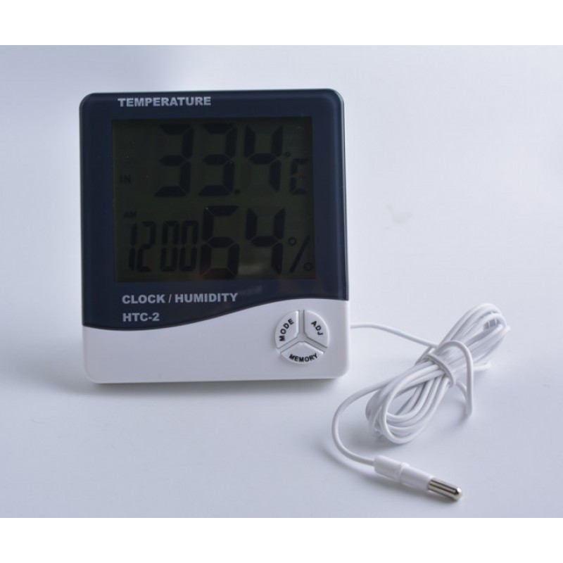 Цифровий термометр-гігрометр HTC-2 це комбінований прилад для вимірювання температури та вологості в приміщенні. Вимірювач температури та вологості повітря використовують для контролю параметрів мікроклімату в житлових, виробничих та складських приміщеннях. За допомогою кріплення, його можна повісити на стіну, або використовувати як настільну метеостанцію. Термо-гігрометр HTC-2 оснащений годинником, має режим будильника та функцію пам’яті останніх макс/хв., значень температури та вологості повітря. Всі дані виводяться на великий РК-дисплей великими символами. Роботу приладу забезпечує 1 батарейка 1,5V AAA (міні пальчик), яка постачається в комплекті з термогігрометром.