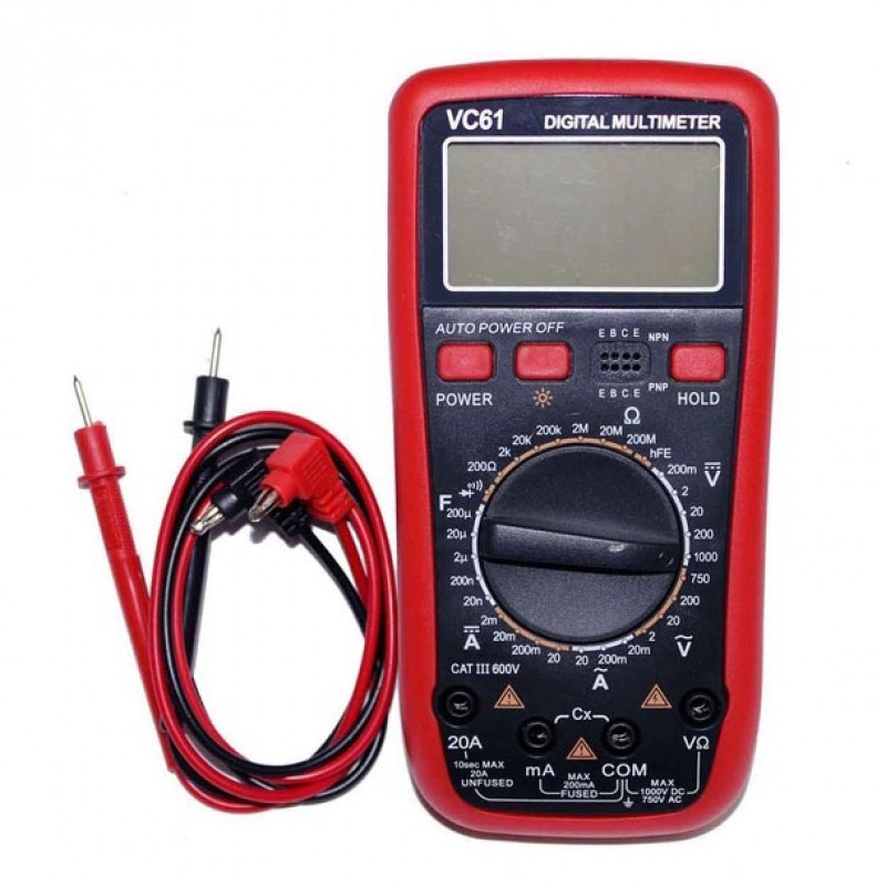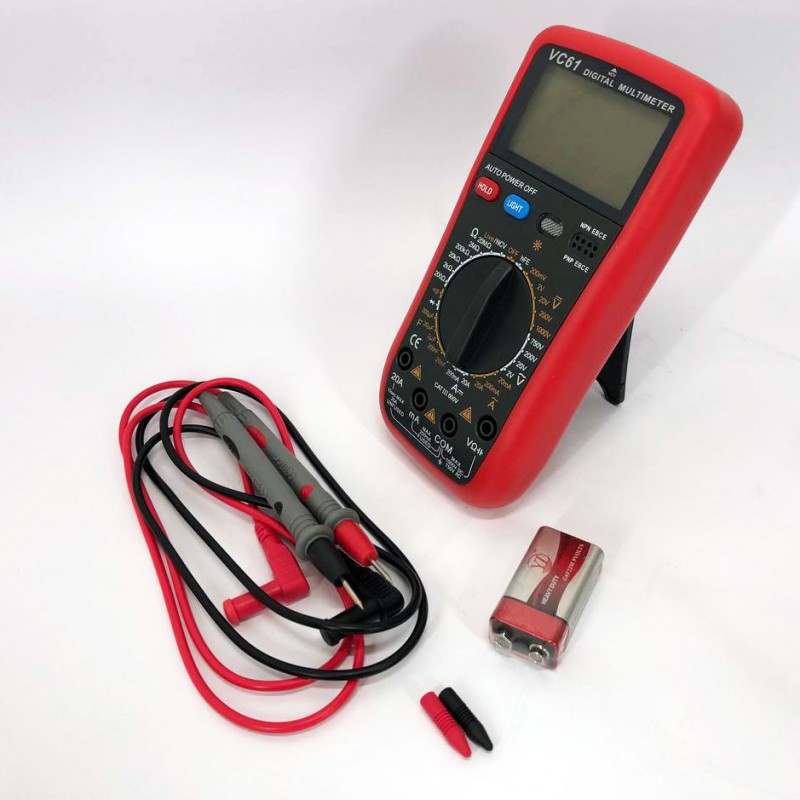 Цифровий мультиметр VC61 призначений для вимірювання опору, постійного та змінного струмів, продзвонювання, вимірювання ємностей, температури. Головні відмінності від більш дешевих аналогів: прогумований корпус, біле підсвічування, великий екран, якість щупів та проводів помітно покращено.