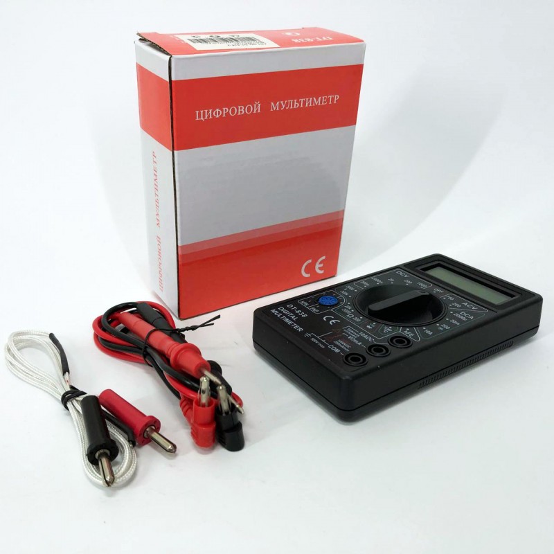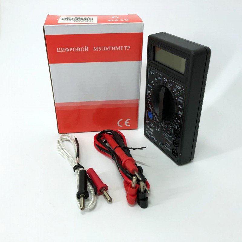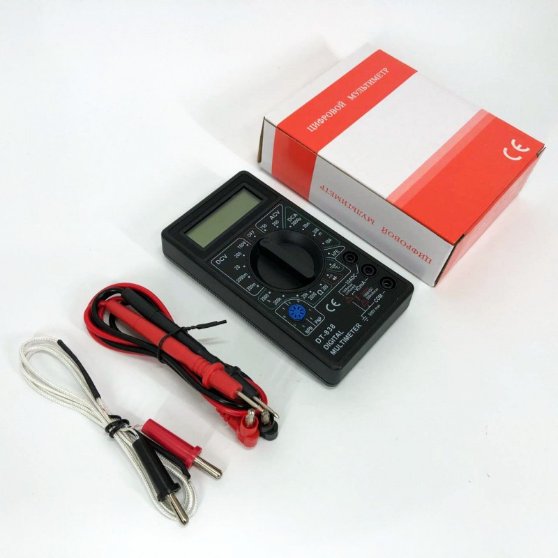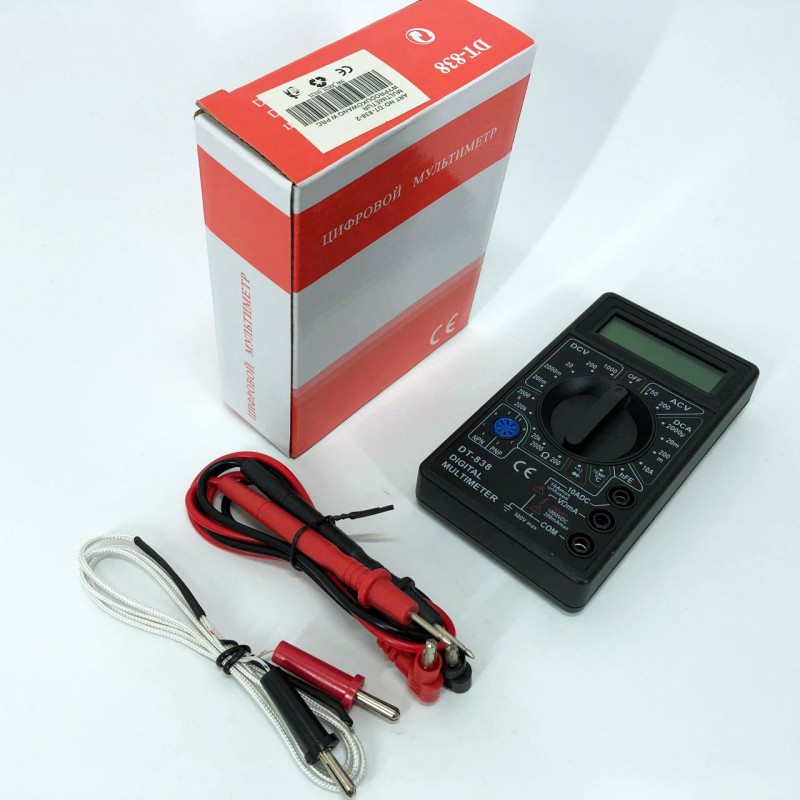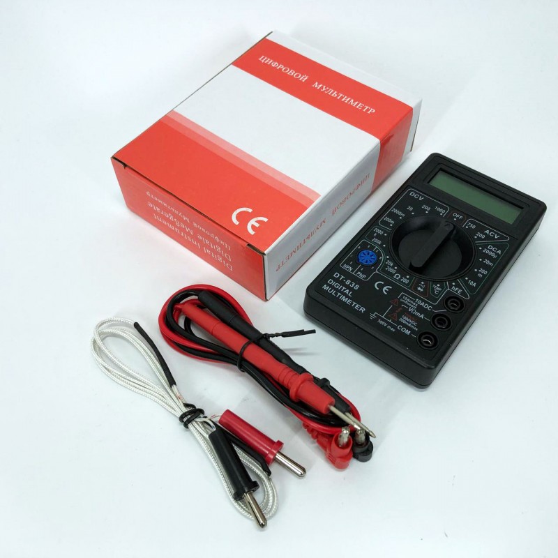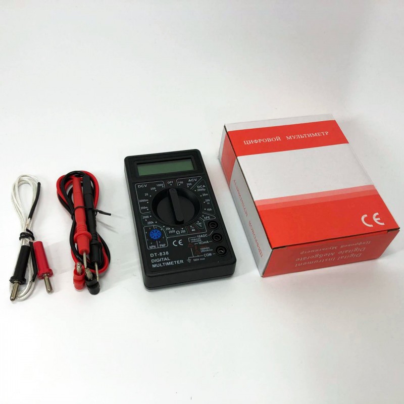 DT838 – цифровий мультиметр, призначений для виконання вимірювання змінної та постійної напруги, постійного струму та опору, оснащений функціями тестування транзисторів (PNP/NPN типу), перевірки ланцюга на провідність, а також вбудованим термометром із термопарою К-типу. Незважаючи на невисоку вартість, мультиметр DT838 забезпечує високу точність при вимірюванні основних параметрів ланцюга. Відмінною особливістю від молодшої моделі DT830B мультиметр DT838 має функцію вимірювання температури, при цьому його вартість лише трохи вища.