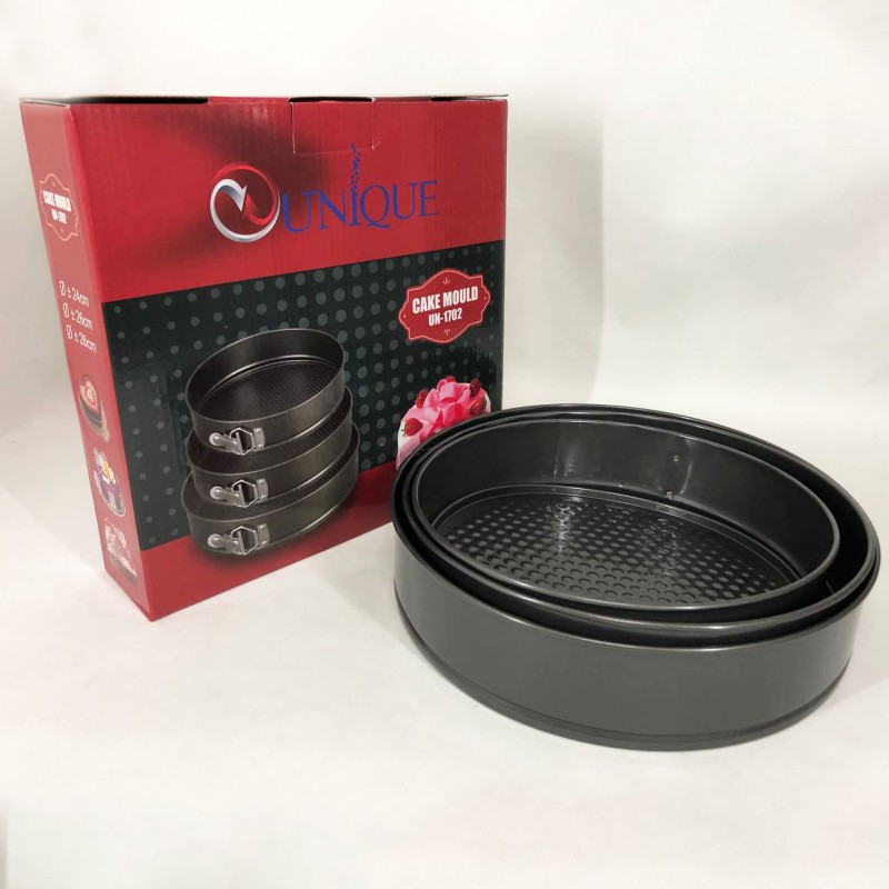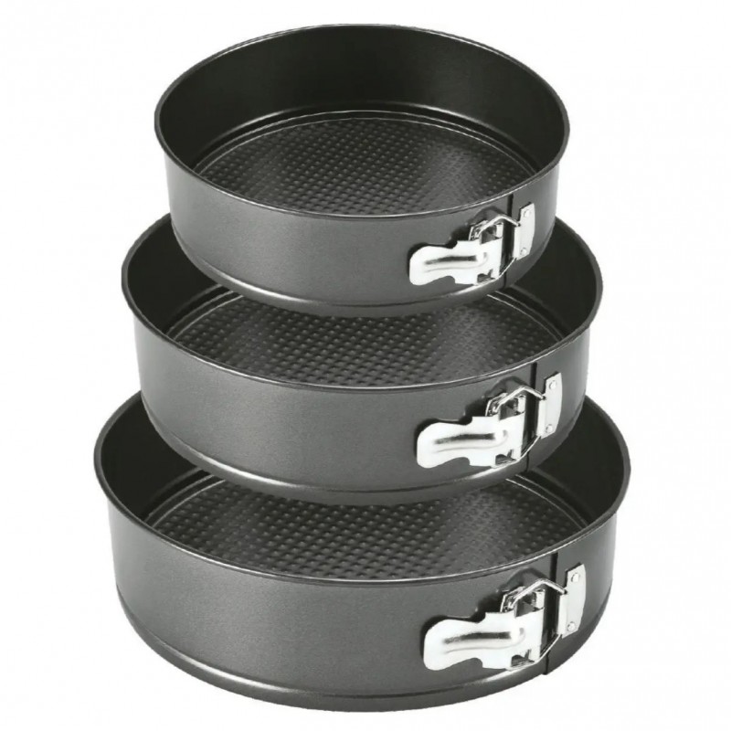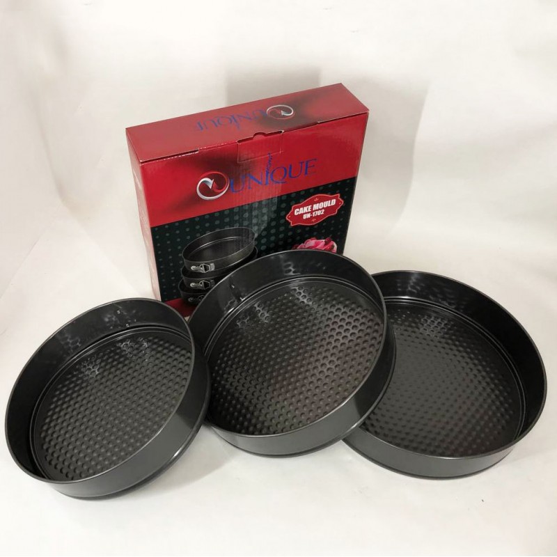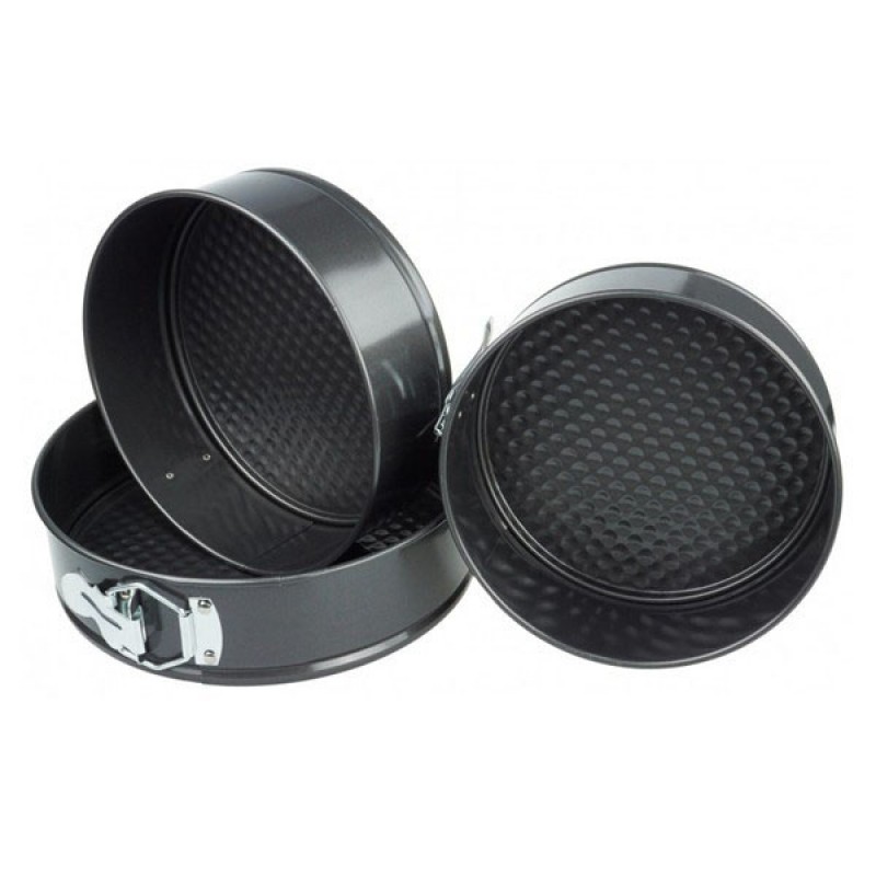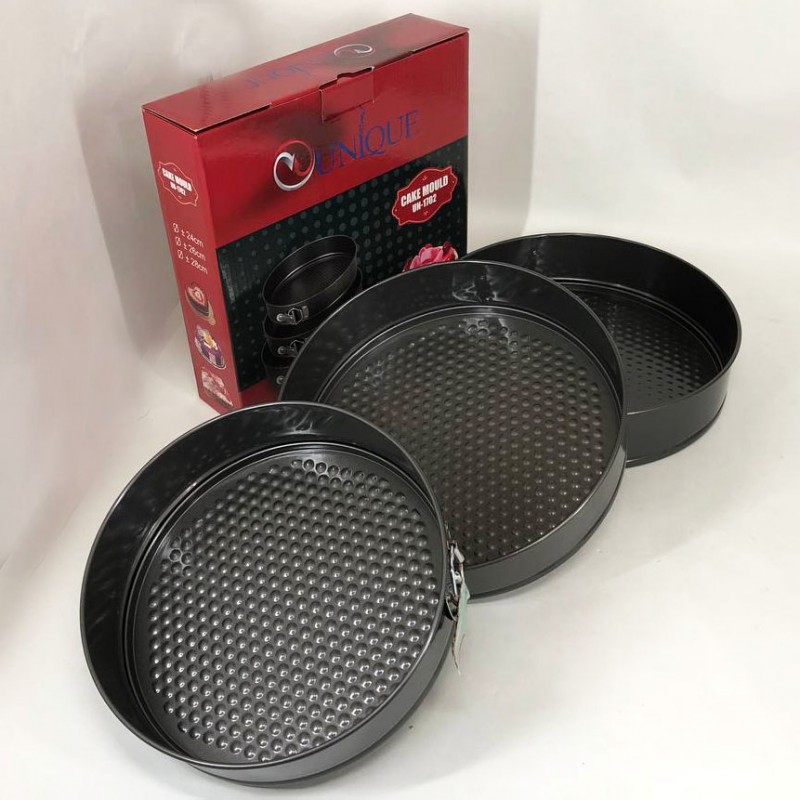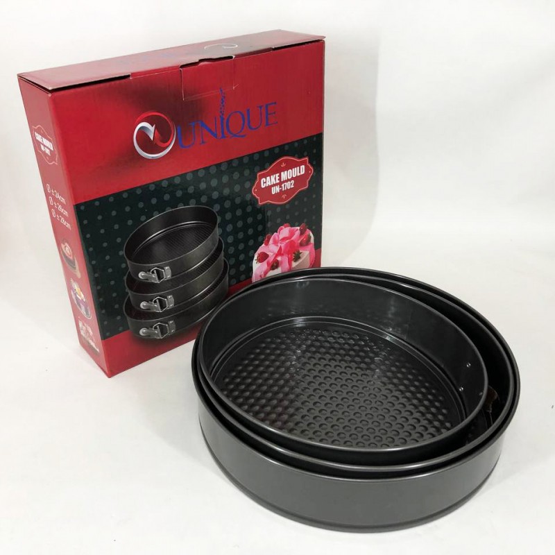 Набір роз’ємних круглих форм UNIQUE для випічки виготовлений з якісної вуглецевої сталі, покритої спеціальним антипригарним покриттям для комфортного використання та легкого догляду. У наборі 3 круглі форми різного діаметру. Тепер ви з легкістю зможете одночасно випікати одразу 3 коржі для багатоярусного торта або кілька різних пирогів. Форми мають надійні затискачі, які утримують дно, а роз’ємна конструкція забезпечить зручне зняття форми з коржею. Безпечне рифлене покриття має антипригарний ефект і гарантує ідеальне випікання ваших страв. Ви будете в захваті від універсальності цього набору форм.