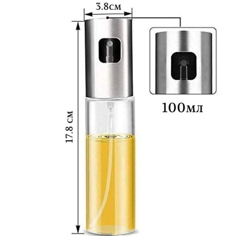 Пляшечка зі спреєм для харчових рідин (олія, оцет) 100мл допоможе рівномірно нанести рідину на продукти і використовувати саме ту кількість олії, яка вам потрібна.