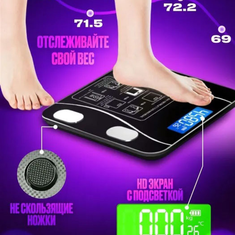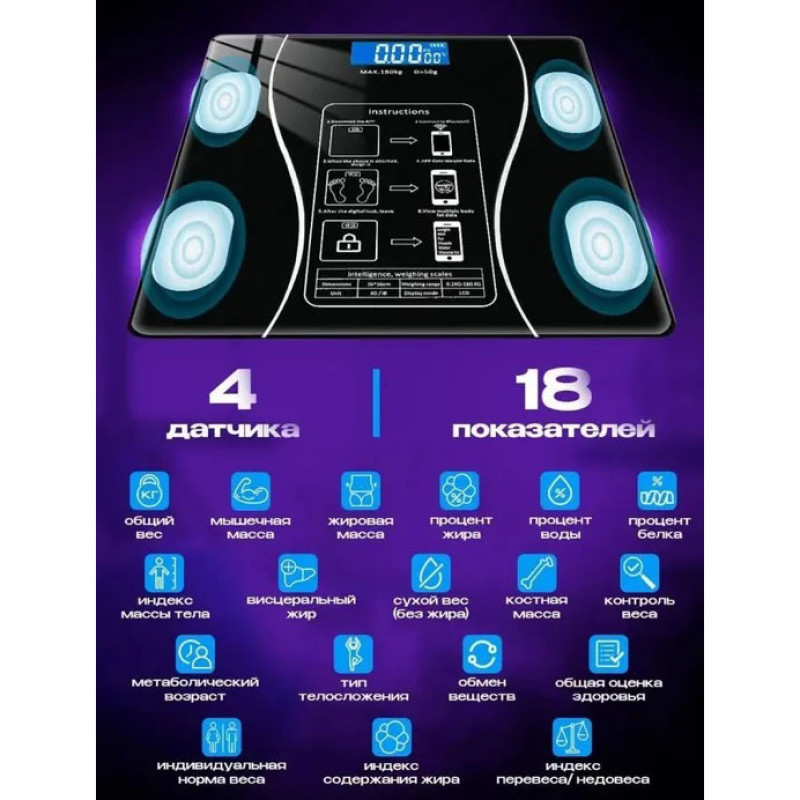 Смарт-ваги пропонують комплексний аналіз стану тіла, що включає 13 основних показників.  ;Таких як вага, відсотковий вміст в організмі жиру та води, м’язової та кісткової маси, індекс маси тіла та інші показники здоров’я вашого тіла.
