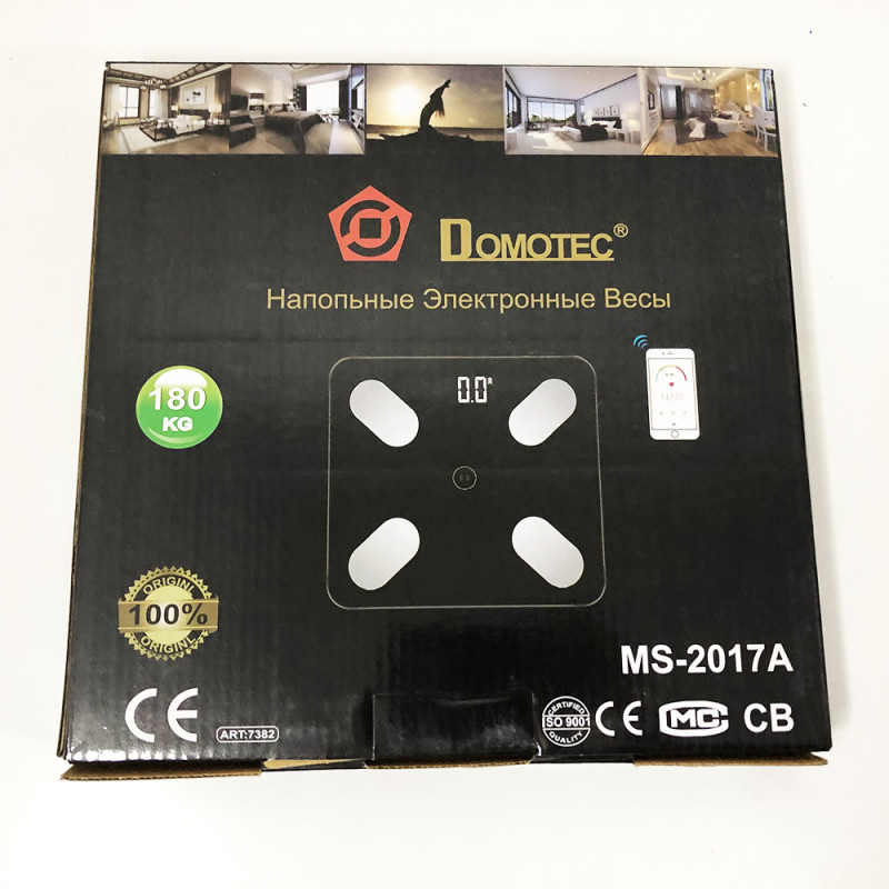Ваги ваги Domotec виготовлені з міцного скла квадратної форми. Завдяки компактним розмірам, ваги підлоги зручно зберігати – не займуть багато місця. Розраховані на вимір ваги в діапазоні до 180 кг. Мобільний додаток можна встановити відсканувавши QR-код з інструкції.